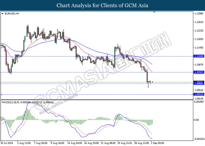 EURUSD, H4: EURUSD telah didagang dengan lebih rendah sementara ia sedang menguji tahap sokongan 1.0980. Namun, MACD yang memaparkan momentum bearish yang telah berkurangan mencadangkan pasangan ini untuk mengalami pembetulan teknikal ke arah tahap rintangan 1.1030.