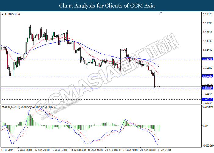 EURUSD, H4: EURUSD telah didagang dengan lebih rendah sementara ia sedang menguji tahap sokongan 1.0980. Namun, MACD yang memaparkan momentum bearish yang telah berkurangan mencadangkan pasangan ini untuk mengalami pembetulan teknikal ke arah tahap rintangan 1.1030.