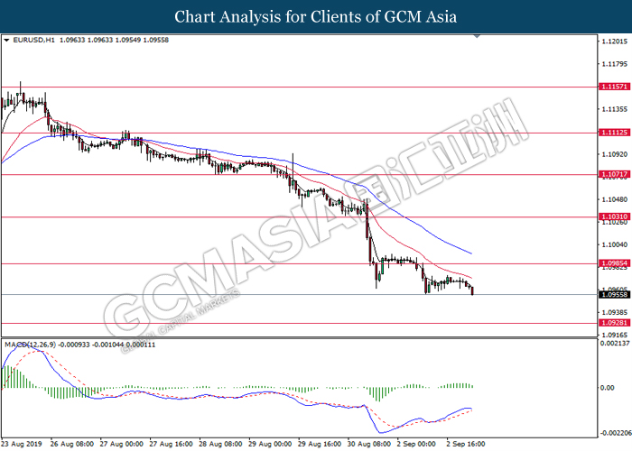 EURUSD, H1: EURUSD telah didagang dengan lebih rendah selepas ia berundur dari garisan 20-MA (merah). MACD yang memaparkan penyusutan pada momentum bullish mencadangkan pasangan ini untuk menurun dan menuju ke arah 1.0930.