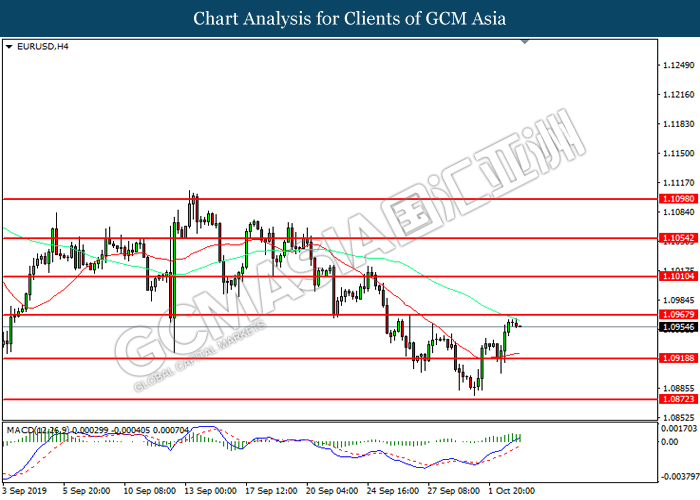 EURUSD, H4: EURUSD telah didagang dengan lebih tinggi selepas ia melantun dari tahap sokongan 1.0920. MACD yang memaparkan momentum bullish mencadangkan pasangan ini untuk melanjutkan keuntungannya ke arah tahap rintangan 1.0965.