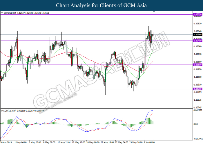 EURUSD, H4: EURUSD telah didagang dengan lebih tinggi selepas ia memecahkan pada tahap rintangan sebelumnya di 1.1240. Namun, MACD yang menunjukkan momentum bullish yang berkurangan mencadangkan pasangan ini untuk mengalami pembetulan teknikal jangka pendek dan berundur kembali ke arah tahap sokongan di 1.1240.