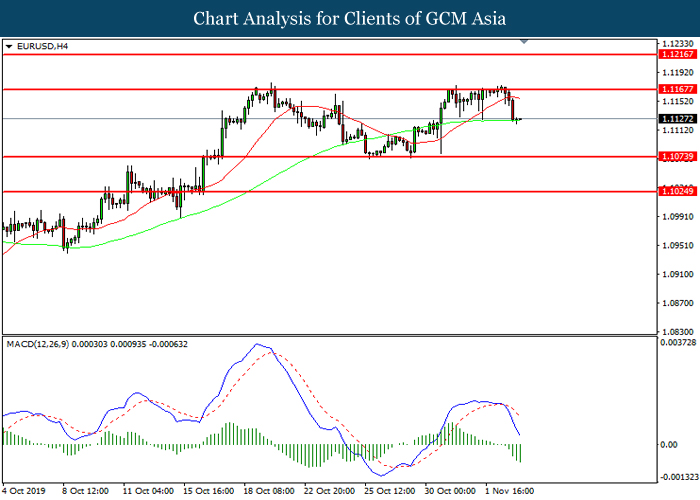 EURUSD, H4: EURUSD telah didagang dengan lebih rendah selepas ia berundur dari tahap rintangan 1.1165. MACD yang memaparkan momentum bearish mencadangkan pasangan ini untuk melanjutkan kerugiannya ke arah tahap sokongan 1.1075.