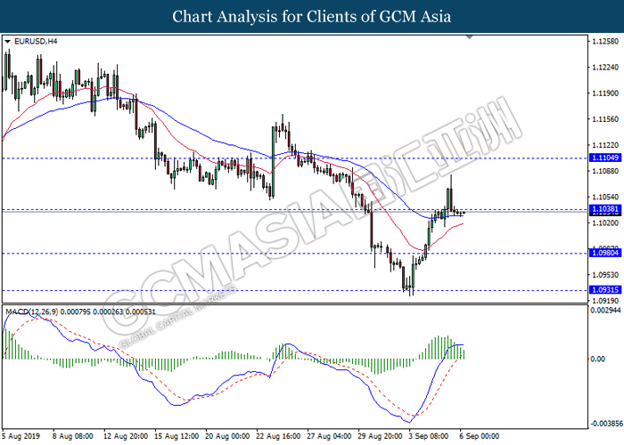EURUSD, H4: EURUSD telah didagang dengan lebih rendah berikutan dengan pemecahan pada tahap sokongan sebelumnya 1.1040. MACD yang memaparkan isyarat momentum bullish yang telah berkurangan mencadangkan pasangan ini untuk melanjutkan kerugiannya ke arah tahap sokongan 1.0980.