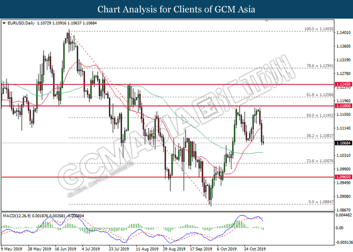EURUSD, Daily: EURUSD telah didagang dengan lebih rendah selepas ia memecahkan 1.1085. MACD yang memaparkan isyarat bearish mencadangkan pasangan ini untuk meneruskan kerugiannya dan menuju ke arah 1.1010.