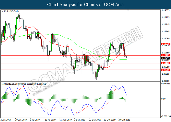 EURUSD, Daily: EURUSD telah didagang dengan lebih rendah selepas ia memecah tahap sokongan terdahulu 1.1075. MACD yang memaparkan momentum bearish mencadangkan pasangan ini untuk melanjutkan kerugiannya ke arah tahap sokongan 1.1010.