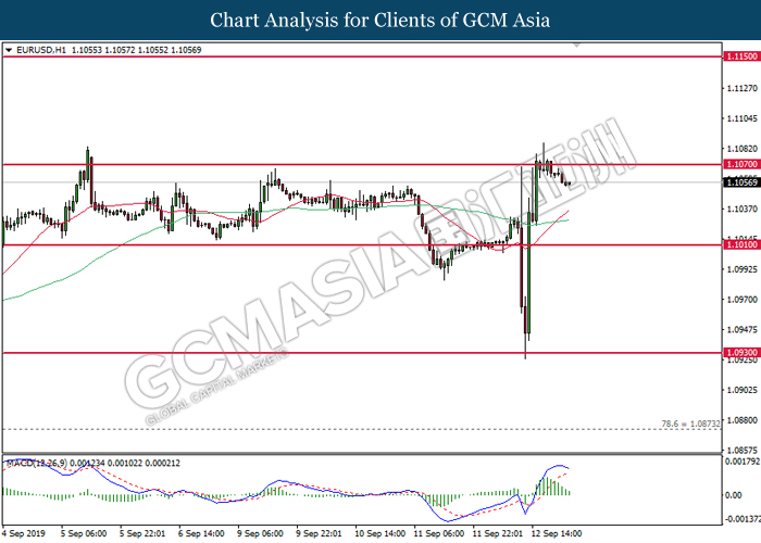 EURUSD, H1: EURUSD telah didagang dengan lebih rendah selepas ia berundur dari 1.1070. MACD yang memaparkan penyusutan pada momentum menaik mencadangkan pasangan ini untuk didagang dengan lebih rendah bagi jangka pendek sebagai pembetulan teknikal.