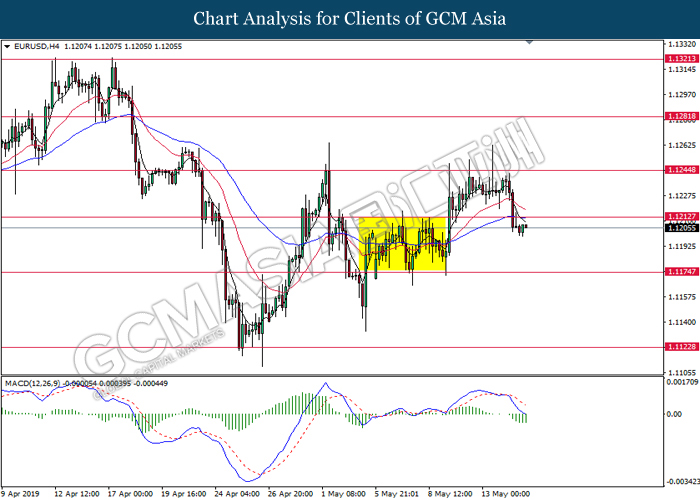 EURUSD, H4: EURUSD telah didagang dengan lebih rendah susulan dengan pemecahan dari tahap sokongan sebelumnya di 1.1215. MACD yang memaparkan momentum bearish mencadangkan pasangan ini untuk melanjutkan kerugiannya ke arah tahap sokongan di 1.1175.