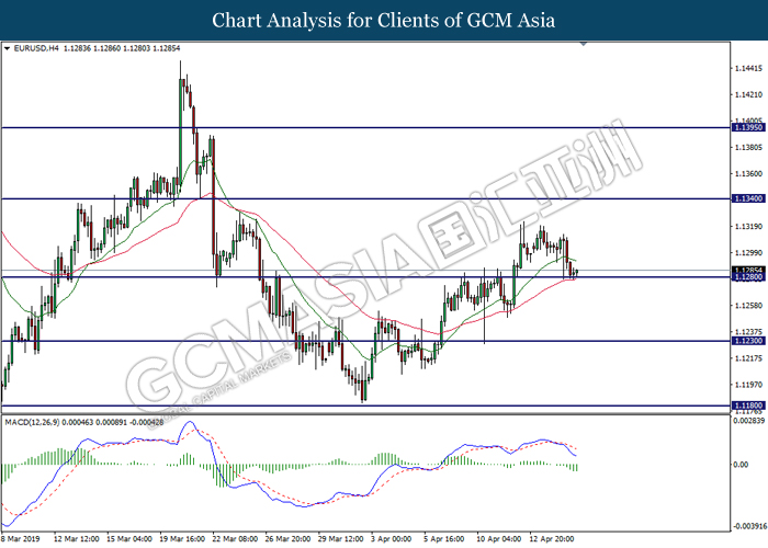 EURUSD, H4: EURUSD telah didagang dengan lebih rendah sementara menguji berdekatan tahap sokongan di 1.1280. Namun, MACD yang menunjukkan momentum bearish yang berkurangan mencadangkan pasangan ini untuk mengalami pembetulan teknikal dan melantun ke arah tahap rintangan di 1.1340.