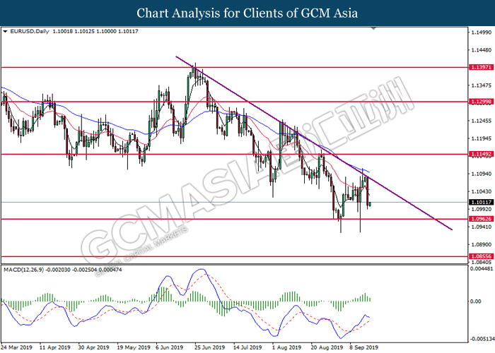 EURUSD, Daily: EURUSD telah didagang dengan lebih rendah selepas ia berundur dari garisan trend menurun. MACD yang memaparkan isyarat bearish mencadangkan pasangan ini untuk menurun selanjutnya dan menuju ke arah 1.0965.