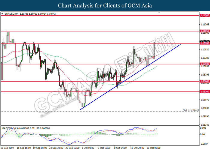 EURUSD, H4: EURUSD telah didagang dengan lebih tinggi selepas ia melantun dari paras rendahnya. MACD yang memaparkan isyarat bullish mencadangkan pasangan ini untuk meningkat bagi jangka pertengahan dan menuju ke arah 1.1105.