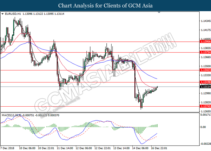 EURUSD, H1: EURUSD telah didagang dengan lebih tinggi berikutan dengan lantunan dari tahap sokongan di 1.1275. MACD yang memaparkan momentum bullish serta formasi silang emas mencadangkan pasangan ini untuk melanjutkan keuntungannya ke arah tahap rintangan di 1.1320.