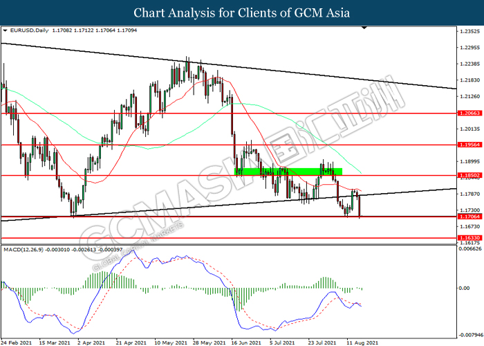EURUSD, Daily: EURUSD telah didagang dengan lebih tinggi sementara kini menguji di tahap sokongan 1.1705. Namun, MACD yang memaparkan momentum bearish mencadangkan pasangan ini untuk mengalami pembetulan teknikal bagi jangka pendek.