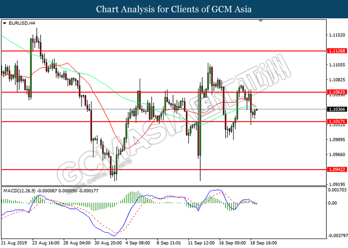 EURUSD, H4: EURUSD telah didagang dengan lebih rendah berikutan dengan pengunduran dari tahap rintangan 1.1065. MACD yang memaparkan momentum bearish mencadangkan pasangan ini untuk melanjutkan kerugiannya ke arah tahap sokongan 1.1015.