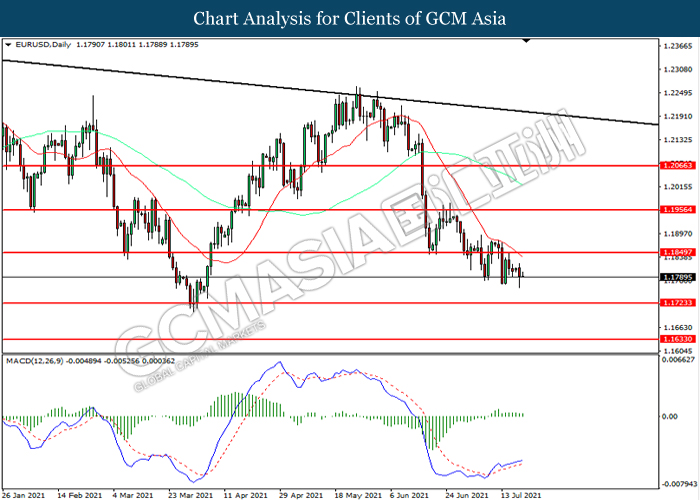 EURUSD, Daily: EURUSD telah didagang dengan lebih rendah selepas ia memecah tahap sokongan terdahulu 1.1850. MACD yang memaparkan momentum bullish yang berkurangan mencadangkan pasangan ini untuk melanjutkan kerugiannya selepas ia memecah tahap sokongan tersebut.