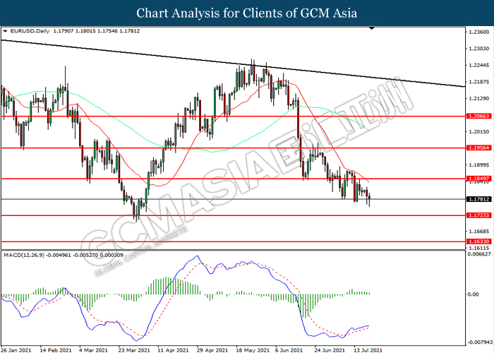 EURUSD, Daily: EURUSD telah didagang dengan lebih rendah selepas ia memecah tahap sokongan terdahulu 1.1850. MACD yang memaparkan mometnum bullish yang berkurangan mencadangkan pasangan ini untuk melanjutkan kerugiannya ke arah tahap sokongan 1.1725.