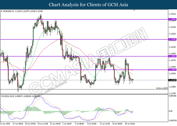 EURUSD, H4: EURUSD telah didagang dengan lebih rendah susulan dengan pemecahan dari tahap sokongan sebelumnya di 1.1245. MACD yang memaparkan isyarat bias bearish mencadangkan pasangan ini untuk melanjutkan kerugiannya ke arah tahap sokongan 1.1185.