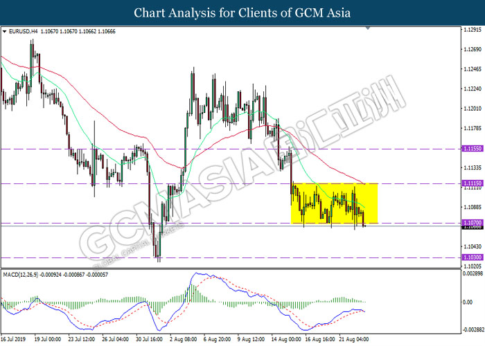 EURUSD, H4: EURUSD telah didagang dengan lebih rendah berikutan dengan pemecahan dari tahap sokongan 1.1070. MACD yang memaparkan momentum bearish dengan permulaan formasi silang kematian mencadangkan pasangan ini untuk melanjutkan kerugiannya ke arah tahap sokongan 1.1030.
