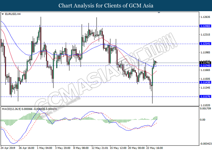EURUSD, H4: EURUSD telah didagang dengan lebih tinggi berikutan dengan pemecahan dari tahap rintangan sebelumnya di 1.1175. Namun, MACD yang menunjukkan momentum bullish yang berkurangan mencadangkan pasangan ini untuk mengalami pembetulan teknikal jangka pendek dan berundur kembali ke arah tahap sokongan 1.1175.