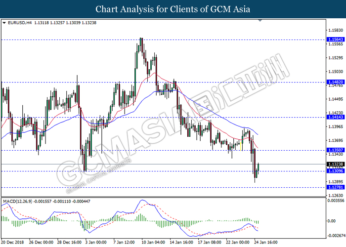 EURUSD, H4: EURUSD telah didagang dengan lebih tinggi berikutan dengan lantunan dari tahap sokongan 1.1310. MACD yang memaparkan momentum bearish yang telah berkurangan mencadangkan pasangan ini untuk melanjutkan lantunannya ke arah tahap rintangan 1.1350.