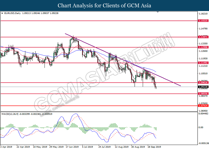 EURUSD, Daily: EURUSD telah didagang dengan lebih rendah selepas ia memecah tahap sokongan sebelumnya 1.0965. MACD yang memaparkan isyarat momentum bearish mencadangkan pasangan ini untuk melanjutkan kerugiannya ke arah tahap sokongan 1.0855.