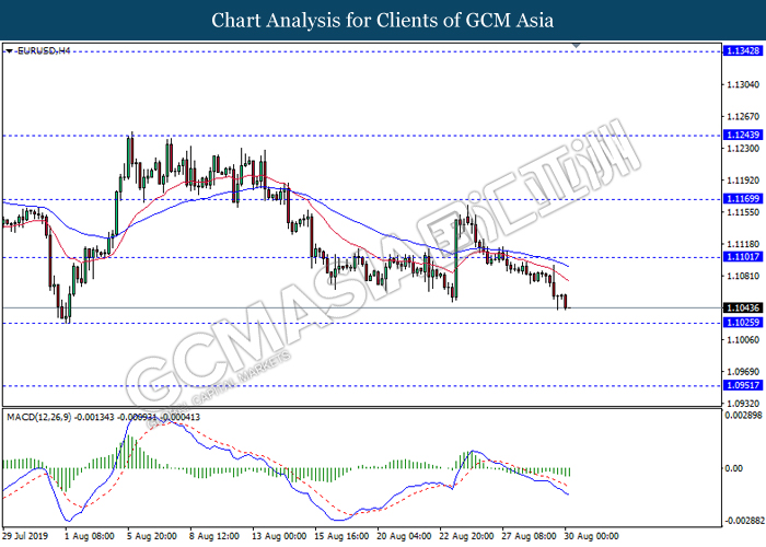 EURUSD, H4: EURUSD telah didagang dengan lebih rendah berikutan dengan pemecahan pada tahap sokongan sebelumnya 1.1100. MACD yang memaparkan isyarat bias bearish mencadangkan pasangan ini untuk melanjutkan kerugiannya ke arah tahap sokongan 1.1025.