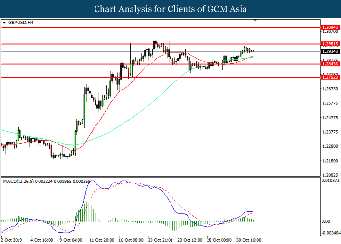 GBPUSD, H4: GBPUSD telah didagang di dalam saluran sisi sementara kini berhampiran dengan tahap rintangan 1.2980. MACD yang memaparkan momentum bullish yang berkurangan mencadangkan pasangan ini untuk didagang dengan lebih rendah ke arah tahap sokongan 1.2845.