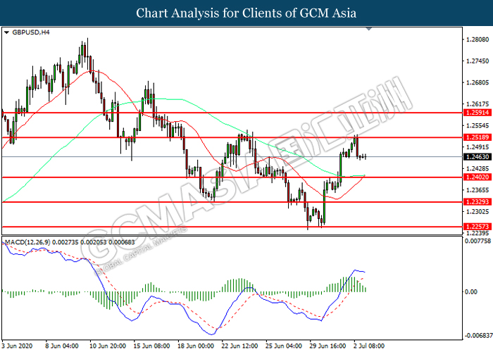 GBPUSD, H4: GBPUSD telah didagang dengan lebih rendah selepas ia berundur dari tahap rintangan 1.2520. MACD yang memaparkan momentum bullish yang berkurangan mencadangkan pasangan ini untuk melanjutkan kerugiannya ke arah tahap sokongan 1.2400.