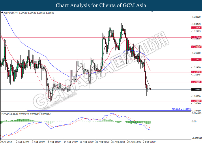GBPUSD, H4: GBPUSD telah didagang dengan lebih rendah selepas ia memecahkan tahap sokongan di 1.2085. MACD yang memaparkan bias bearish mencadangkan pasangan ini untuk meneruskan kerugiannya dan menuju ke arah 1.2015.