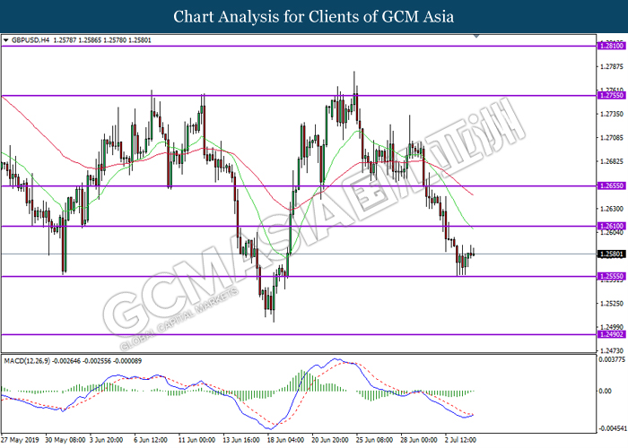 GBPUSD, H4: GBPUSD telah didagang dengan lebih tinggi berikutan dengan lantunan dari tahap sokongan di 1.2555. MACD yang menunjukkan isyarat bias bullish dengan permulaan formasi silang emas mencadangkan pasangan ini untuk melanjutkan lantunannya ke arah tahap rintangan di 1.2610.