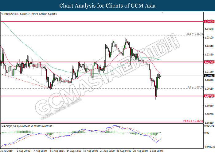 GBPUSD, H4: GBPUSD telah didagang dengan lebih tinggi selepas ia melantun dari tahap sokongan 1.1975. MACD yang memaparkan isyarat bullish mencadangkan pasangan ini untuk meningkat selepas ia ditutup di atas garisan 20-MA (merah).