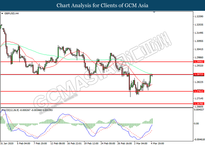 GBPUSD, H4: GBPUSD telah didagang dengan lebih tinggi sementara kini menguji di tahap rintangan 1.2875. MACD yang memaparkan momentum bullish mencadangkan pasangan ini untuk melanjutkan keuntungannya selepas ia memecah tahap rintangan tersebut.