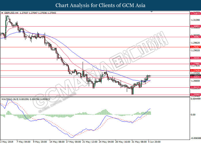 GBPUSD, H4: GBPUSD telah didagang dengan lebih tinggi selepas pemecahan berlaku di 1.2695. MACD yang memaparkan isyarat bullish mencadangkan pasangan ini untuk melanjutkan keuntungannya dan menuju ke arah 1.2745.