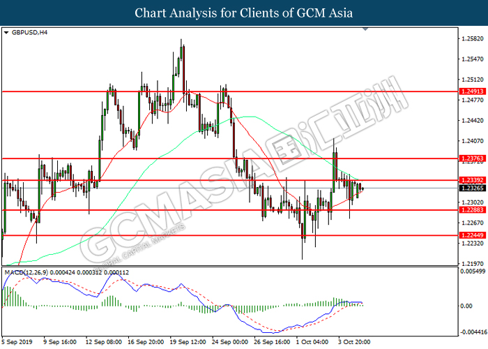 GBPUSD, H4: GBPUSD telah didagang dengan lebih rendah selepas ia berundur dari tahap sokongan 1.2340. MACD yang memaparkan momentum bullish yang berkurangan mencadangkan pasangan ini untuk melanjutkan kerugiannya ke arah tahap sokongan 1.2290.