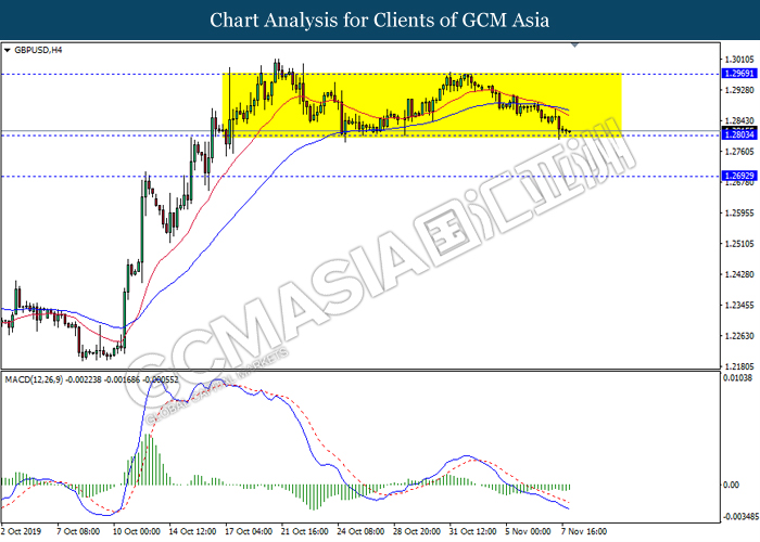 GBPUSD, H4: GBPUSD kekal didagang dalam saluran sisi sementara ia sedang menguji berhampiran dengan tahap sokongan 1.2805. Namun, MACD yang memaparkan isyarat momentum bearish yang telah berkurangan mencadangkan pasangan ini untuk didagang dengan lebih tinggi dalam jangka pendek sebagai pembetulan teknikal ke arah tahap rintangan 1.2970.
