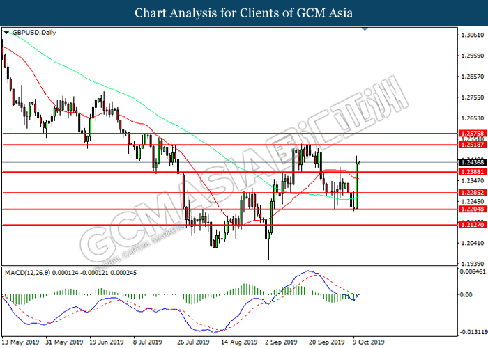 GBPUSD, Daily: GBPUSD telah didagang dengan lebih tinggi selepas ia memecah tahap rintangan terdahulu 1.2385. MACD yang memaparkan momentum bearish yang berkurangan mencadangkan pasangan ini untuk melanjutkan keuntungannya ke arah tahap rintangan 1.2520.