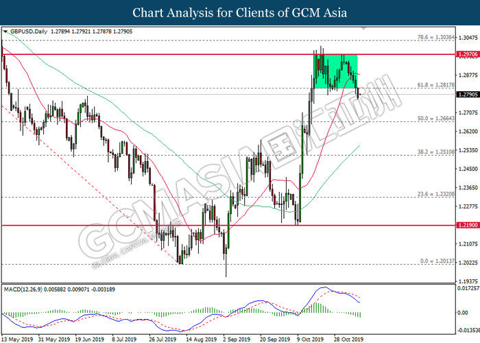 GBPUSD, Daily: GBPUSD telah didagang dengan lebih rendah selepas ia ditutup di bawah 1.2820. MACD yang memaparkan isyarat bearish mencadangkan pasangan ini untuk didagang dengan lebih rendah dan menuju ke arah 1.2665.