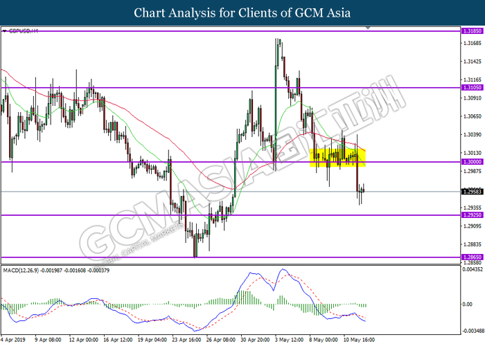 GBPUSD, H4: GBPUSD telah didagang dengan lebih rendah susulan dengan pemecahan dari tahap sokongan sebelumnya di 1.3000. MACD yang menunjukkan momentum bearish mencadangkan pasangan ini untuk melanjutkan kerugiannya ke arah tahap sokongan di 1.2925.