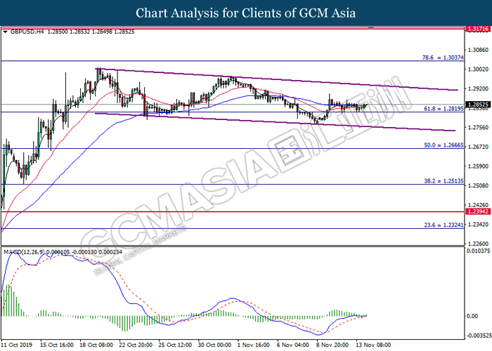 GBPUSD, H4: GBPUSD telah didagang dengan lebih tinggi selepas ia melantun dari tahap sokongan sebelumnya di 1.2820. MACD yang memaparkan isyarat bullish mencadangkan pasangan ini untuk melanjutkan keuntungannya ke arah paras tinggi saluran menurun.