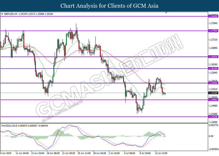 GBPUSD, H4: GBPUSD telah didagang dengan lebih rendah berikutan dengan pemecahan dari tahap sokongan sebelumnya di 1.2555. MACD yang menunjukkan momentum bearish dengan formasi silang kematian mencadangkan pasangan ini untuk melanjutkan kerugiannya ke arah tahap sokongan di 1.2490.