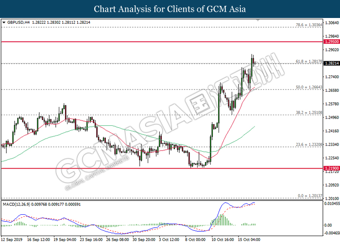 GBPUSD, H4: GBPUSD telah didagang dengan lebih rendah selepas ia berundur dari paras tingginya. MACD yang memaparkan penyusutan pada momentum menaik mencadangkan pasangan ini untuk menurun selepas pemecahan berlaku di 1.2820.