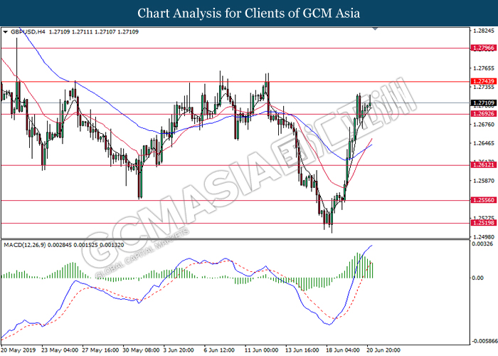 GBPUSD, H4: GBPUSD telah didagang dengan lebih tinggi berikutan dengan pemecahan dari tahap rintangan sebelumnya di 1.2695. Namun, MACD yang memaparkan penyusutan dalam momentum bullish mencadangkan pasangan ini untuk berundur kembali ke arah tahap sokongan 1.2695 sebagai pembetulan teknikal.