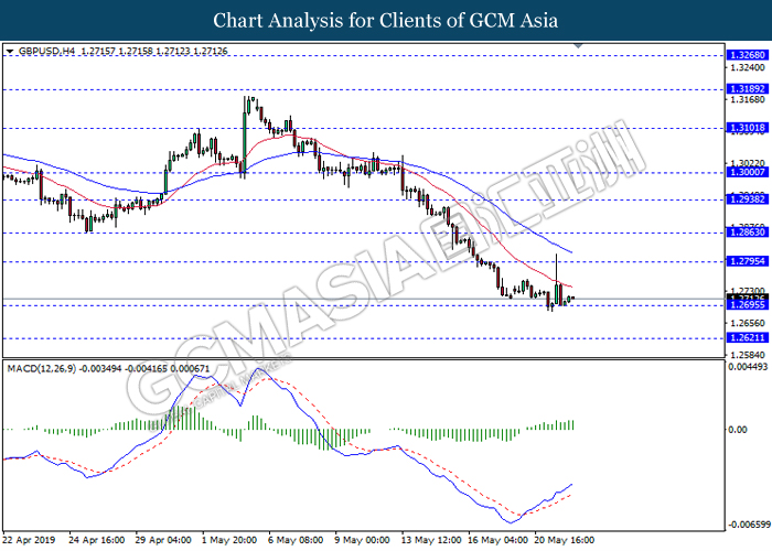 GBPUSD, H4: GBPUSD telah didagang dengan lebih rendah sementara menguji berdekatan tahap sokongan di 1.2695. Namun, MACD yang memaparkan isyarat bias bullish mencadangkan pasangan ini untuk mengalami pembetulan teknikal jangka pendek dan melantun ke arah tahap rintangan di 1.2795.