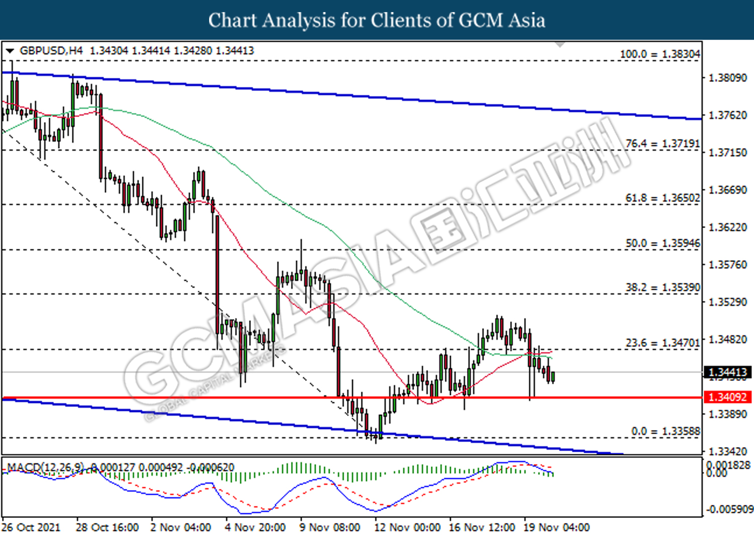 GBPUSD, H4: GBPUSD telah didagang dengan lebih rendah selepas ia memecahkan 1.3470. MACD yang memaparkan isyarat bearish mencadangkan pasangan ini untuk meneruskan penurunnnya bagi jangka pendek.
