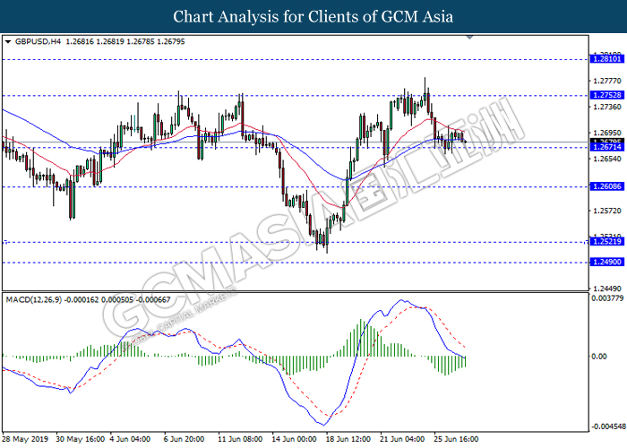 GBPUSD, H4: GBPUSD telah didagang dengan rata sementara ia sedang menguji tahap sokongan 1.2670. Namun, MACD yang memaparkan momentum bearish yang berterusan mencadangkan pasangan ini untuk didagang dengan lebih rendah selepas ie memecah tahap sokongan tersebut.