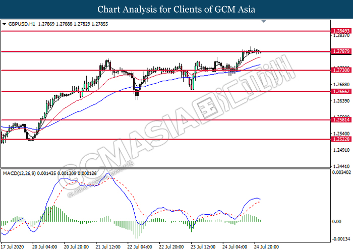 GBPUSD, H1: GBPUSD telah didagang dengan lebih tinggi sementara ia sedangm menguji tahap rintangan di 1.2790. Namun, MACD yang memaparkan isyarat momentum bullish yang berkurangan mencadangkan pasangan ini untuk didagang dengan lebih rendah dalam jangka pendek ke arah tahap sokongan 1.2730.