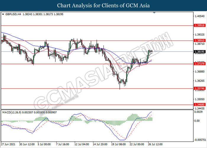 GBPUSD, H4: GBPUSD telah didagang dengan lebih tinggi susulan dengan lantunan dari tahap sokongan 1.3735. MACD yang memaparkan isyarat momentum bullish mencadangkan pasangan ini untuk melanjutkan keuntungannya ke arah tahap rintangan 1.3890.