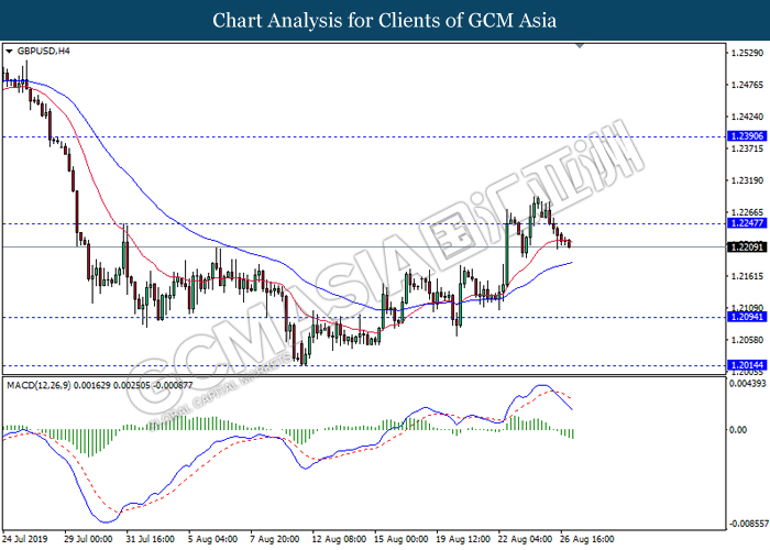 GBPUSD, H4: GBPUSD telah didagang dengan lebih rendah berikutan dengan pemecahan pada tahap sokongan sebelumnya 1.2245. MACD yang memaparkan isyarat momentum bearish dengan formasi silang kematian mencadangkan pasangan ini untuk melanjutkan kerugiannya ke arah tahap sokongan 1.2095.