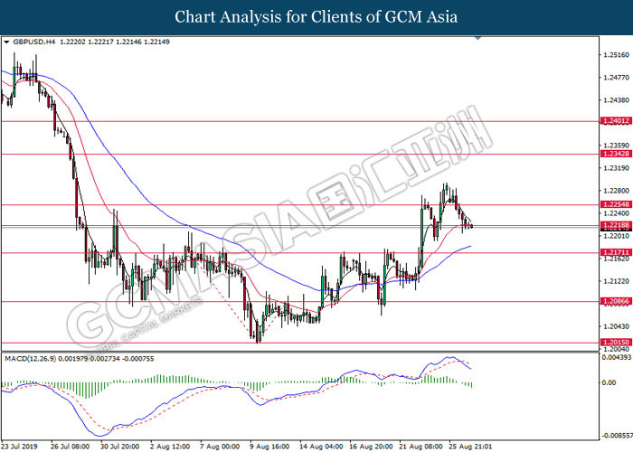 GBPUSD, H4: GBPUSD telah didagang dengan lebih rendah sementara menguji pada tahap sokongan 1.2220. MACD yang memaparkan momentum bearish mencadangkan pasangan ini untuk melanjutkan kerugiannya ke arah tahap sokongan 1.2170.
