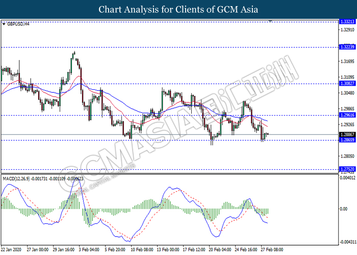 GBPUSD, H4: GBPUSD telah didagang dengan lebih rendah sementara ia sedang menguji berhampiran dengan tahap sokongan 1.2865. MACD yang memaparkan isyarat bias bearish yang berterusan mencadangkan pasangan ini untuk melanjutkan kerugiannya selepas ia memecah tahap sokongan tersebut.