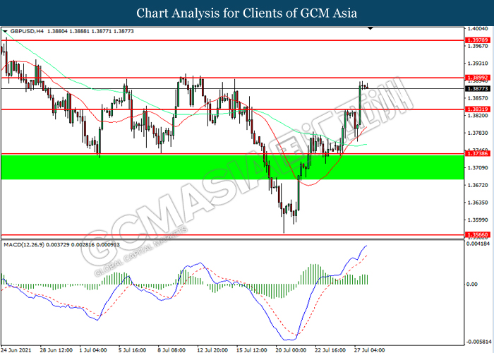 GBPUSD, H4: GBPUSD telah didagang dengan lebih tinggi selepas ia memecah tahap rintangan terdahulu 1.3740. MACD yang memaparkan momentum bullish mencadangkan pasangan ini untuk melanjutkan keuntungannya ke arah tahap rintangan 1.3900.